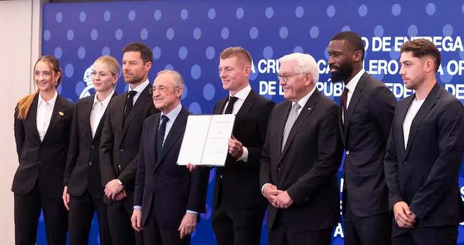 托尼-克罗斯在伯纳乌球场,接受了德国总统弗兰茨-瓦尔特-施泰因迈尔授予的德意志联邦共和国功绩勋章骑士十字勋章。皇马主席弗洛伦蒂诺以及多位皇马现任与前任球员到场见证。